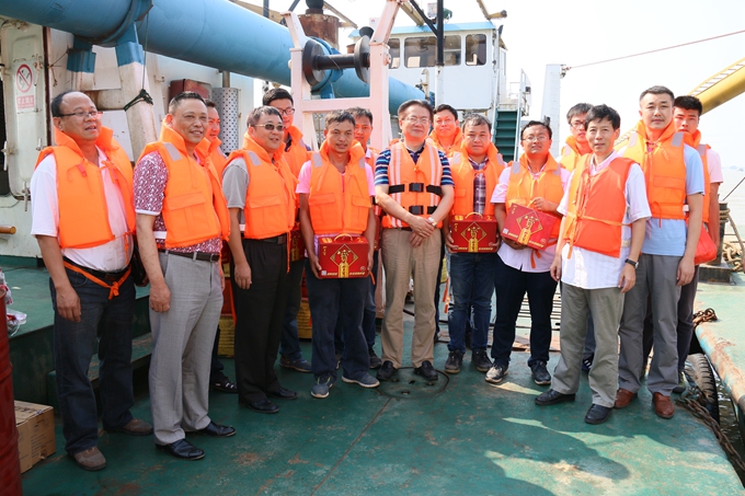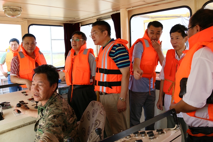 在交通艇上,劉總認(rèn)真聽(tīng)取了安徽交航青弋江疏浚項(xiàng)目的詳細(xì)介紹,了解了施工進(jìn)度和下一步施工計(jì)劃。登船后與船員們一一握手、親切交談,詢(xún)問(wèn)他們生活飲食情況、防暑降溫措施,隨后登上船舶操作室,詳細(xì)了解挖泥船施工技術(shù),通過(guò)GPS定位觀察位于水下的施工作業(yè)面積。劉總囑咐船員們?cè)诖献鳂I(yè)要注意安全,在酷暑天氣保障生產(chǎn)進(jìn)度的同時(shí)切實(shí)做好防暑降溫工作,確保健康防暑、平安防暑。