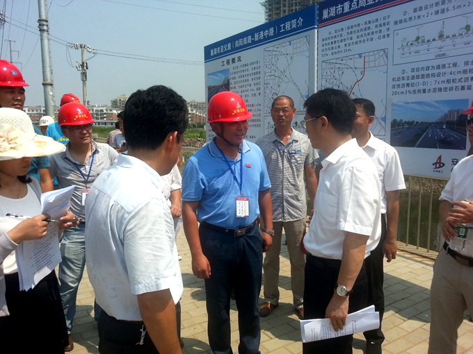 2016年7月28日上午10時(shí),巢湖市市長(zhǎng)張生在巢湖市重點(diǎn)局局長(zhǎng)袁浩及相關(guān)人員陪同下,蒞臨安徽交航承建的亞父路工程施工現(xiàn)場(chǎng),視察指導(dǎo)工作。